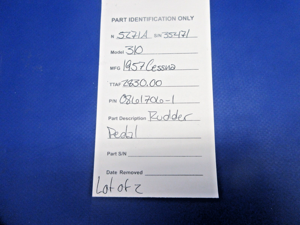 Early Cessna 310 Rudder Pedal. P/N 0861706-1. LOT OF 2. Removed in good condition from a parted out 1957 Cessna 310 N5271A, S/N 35471. TTAF 2,830.00. Guaranteed to pass inspection or your money back.