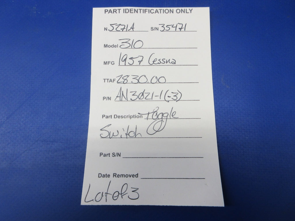 Cessna 310 Toggle Switch. P/N AN3021-1, AN3021-3. LOT OF 3. Removed in good condition from a parted out 1957 Cessna 310 N5271A, S/N 35471. TTAF 2,830.00. Guaranteed to pass inspection or your money back.