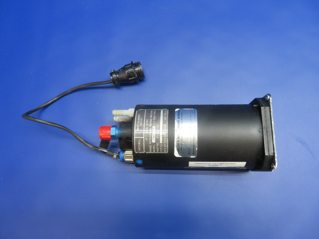 Edo-Aire Mitchell Attitude Gyro with Connector. P/N 52D67, 23-501-05. Converted to model 5000-E. S/N 177091. We are unable to test this unit, however, we are selling this unit with a 30 day warranty. Removed in good condition from a parted out 1965 Cessna 310J N3195L, S/N 310J0195. TTAF 4,435.9. Guaranteed to pass inspection or your money back.