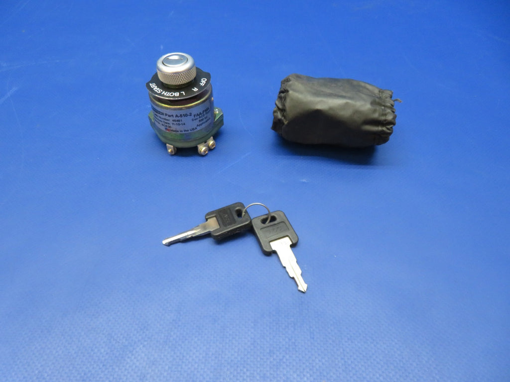 Ercoupe 415E ACS Ignition Switch with Keys. P/N A-510-2. This item was recently tested at 12v and found to be in working condition. Removed in good condition from a parted out 1948 Ercoupe 415E N94791, S/N 4902. TTAF 2,884.7. Guaranteed to pass inspection or your money back.