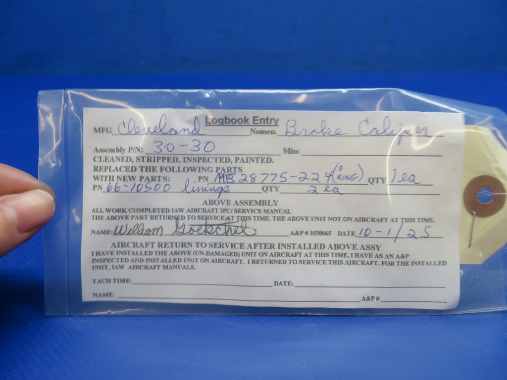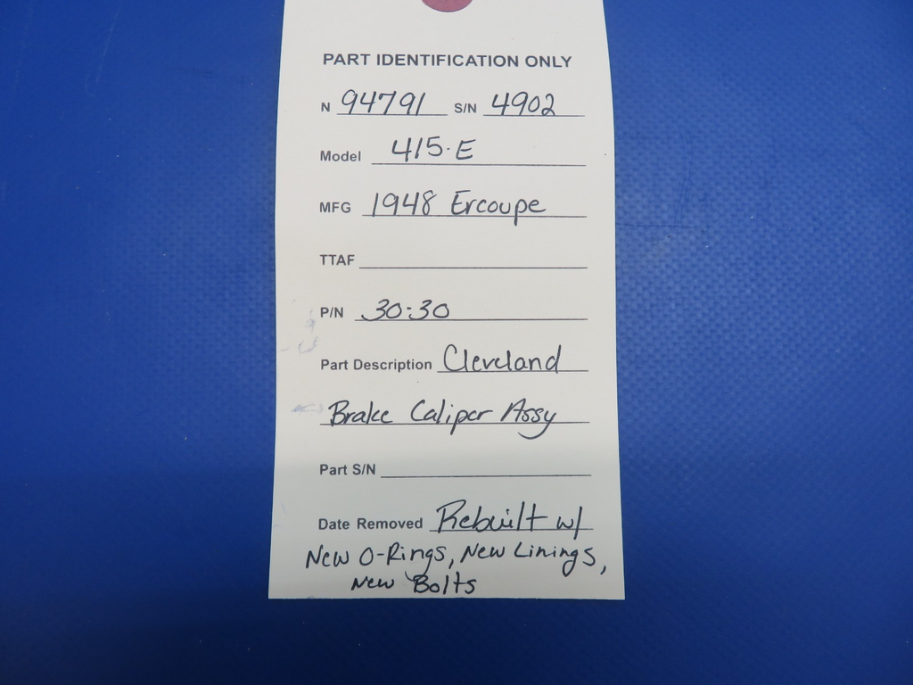 Ercoupe 415E Cleveland Brake Caliper Assembly. P/N 30-30. REBUILT with New Linings, Bolts, and O-Rings. Removed in good condition from a parted out 1948 Ercoupe 415E N94791, S/N 4902. TTAF 2,884.7. Guaranteed to pass inspection or your money back.