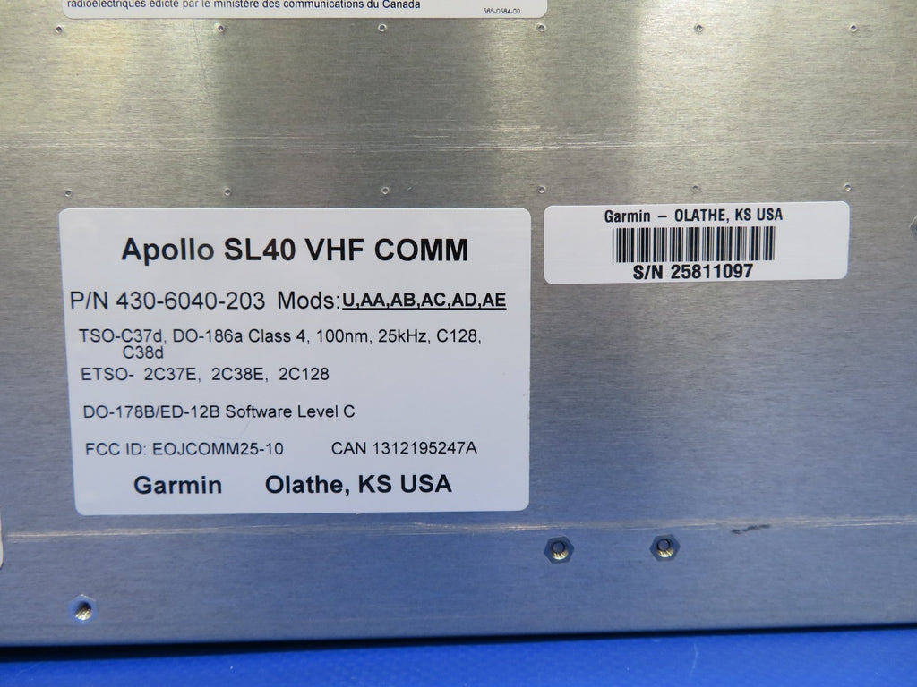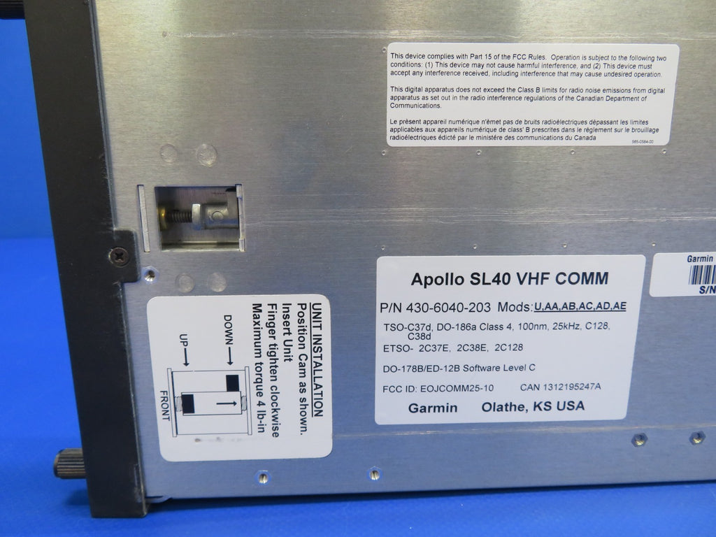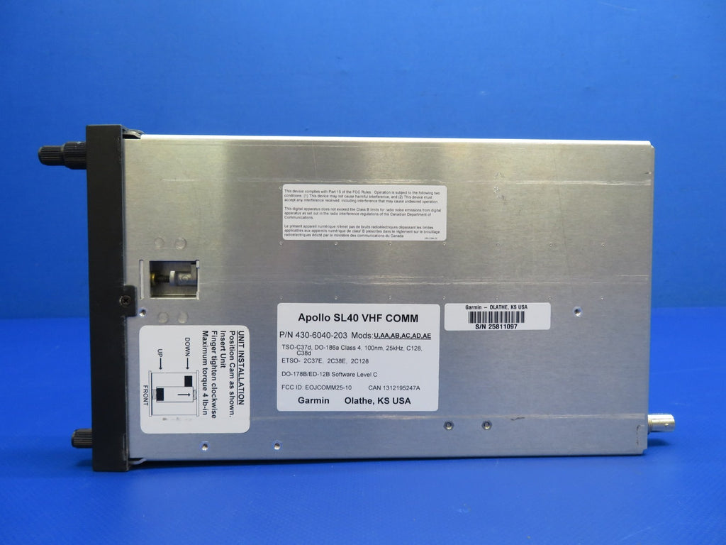 Garmin Apollo SL40 VHF Comm. with Rack and Connector. P/N 430-6040-203. S/N 25811097. Mods U, AA, AB, AC, AD, AE. Rack P/N 310-5181-01. We are unable to test this unit, however, we are selling this unit with a 30 day warranty. Removed in good condition from a parted out 2011 Vans Aircraft RV-12 S/N 120219, N813JC. TTAF 398.7. Guaranteed to pass inspection or your money back.