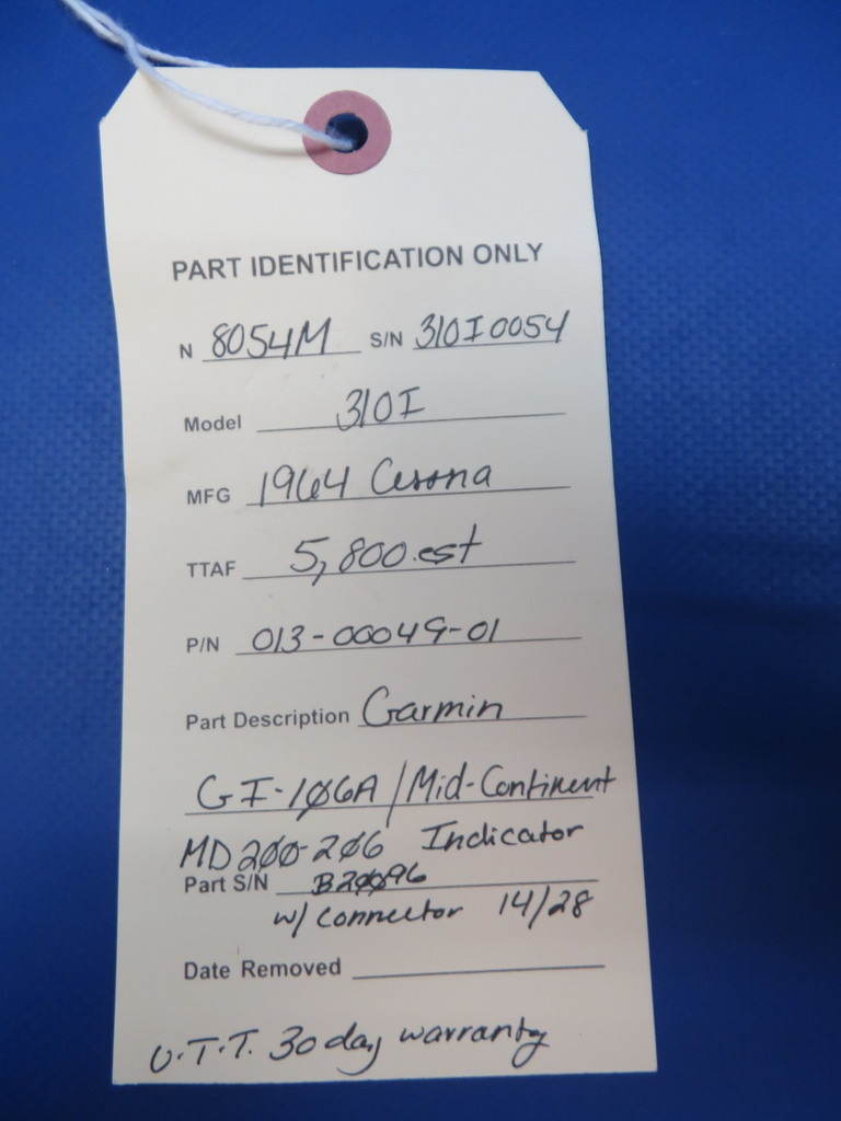 Cessna 310 / 310I Garmin GI-106A Mid-Continent MD200-206 Indicator with Connector 14/28v. P/N 013-00049-01. S/N B20096. We are unable to test this unit, however, we are selling this unit with a 30 day warranty. Removed in good condition from a parted out 1964 Cessna 310I N8054M, S/N 310I0054. Est. TTAF 5,800.0. Guaranteed to pass inspection or your money back.
