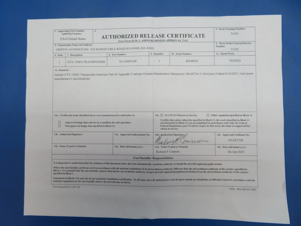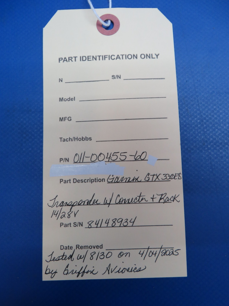Garmin GTX 330ES ADS-B Transponder 14/28v P/N 011-00455-60 w/ 8130 (0425-165)