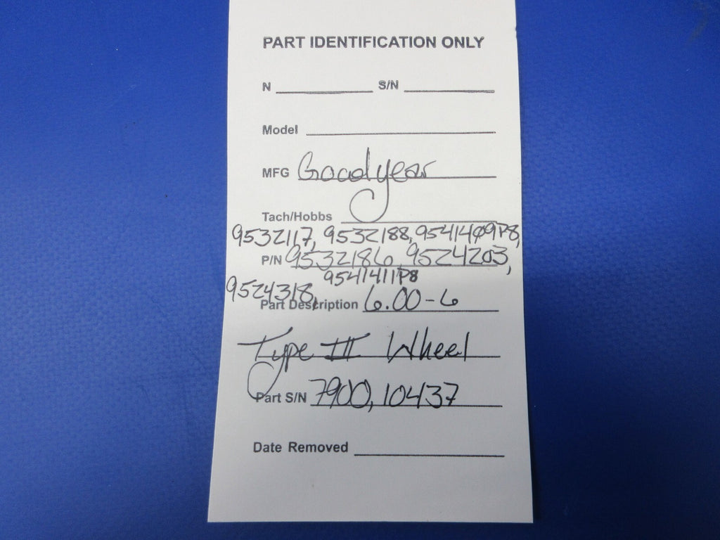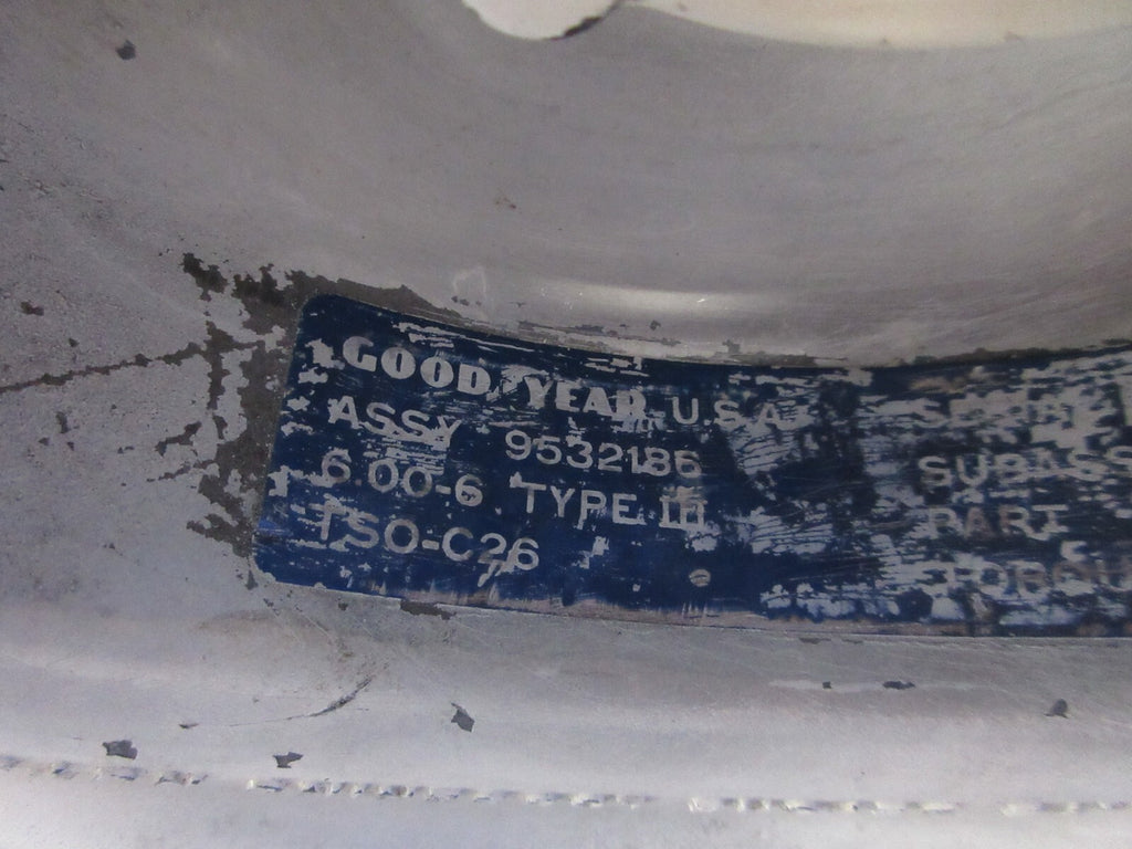 Goodyear 6.00-6 Type III Wheel. P/N 9532117, 9532188, 9541409P8, 9532186, 9524203, 9524318, 9541411P8. S/N 7900, 10437. Guaranteed to pass inspection or your money back.