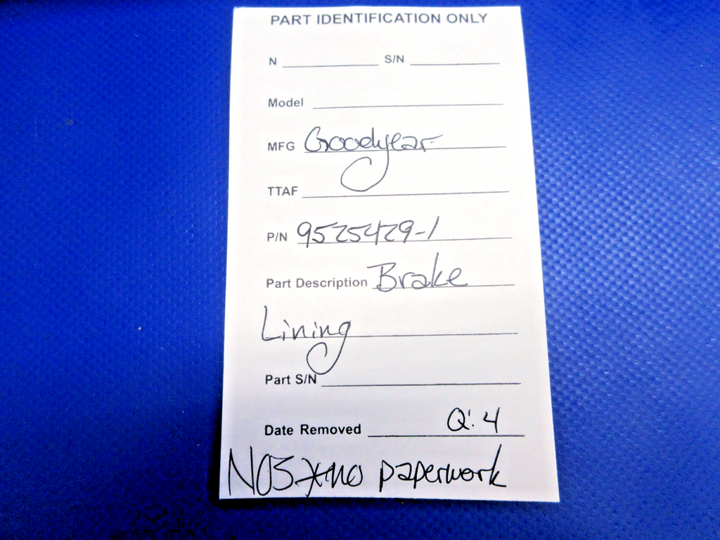 Goodyear Brake Lining. P/N 9525429-1. NEW OLD STOCK. No Paperwork. Due to multiple quantities buyer may not receive exact item pictured. Guaranteed to pass inspection or your money back.