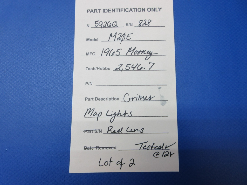 Mooney M20 / M20E Grimes Map Lights. Red Lens. LOT OF 2. This item was recently tested at 12 volts and found to be in working condition. Removed in good condition from a parted out 1965 Mooney M20E N5926Q, S/N 828. TTAF 2,546.7. Guaranteed to pass inspection or your money back.