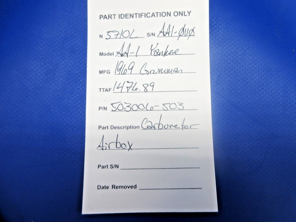 Grumman AA-1 Carburetor Airbox. P/N 503006-503. Removed in good condition from a parted out 1969 Grumman AA-1 N5710L, S/N AA1-0110. TTAF 1,476.89. Guaranteed to pass inspection or your money back.