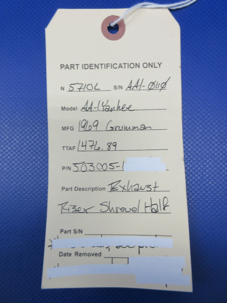 Grumman AA-1 Exhaust Riser Shroud Half. P/N 503005-1. Removed in good condition from a parted out 1969 Grumman AA-1 N5710L, S/N AA1-0110. TTAF 1,476.89. Guaranteed to pass inspection or your money back.