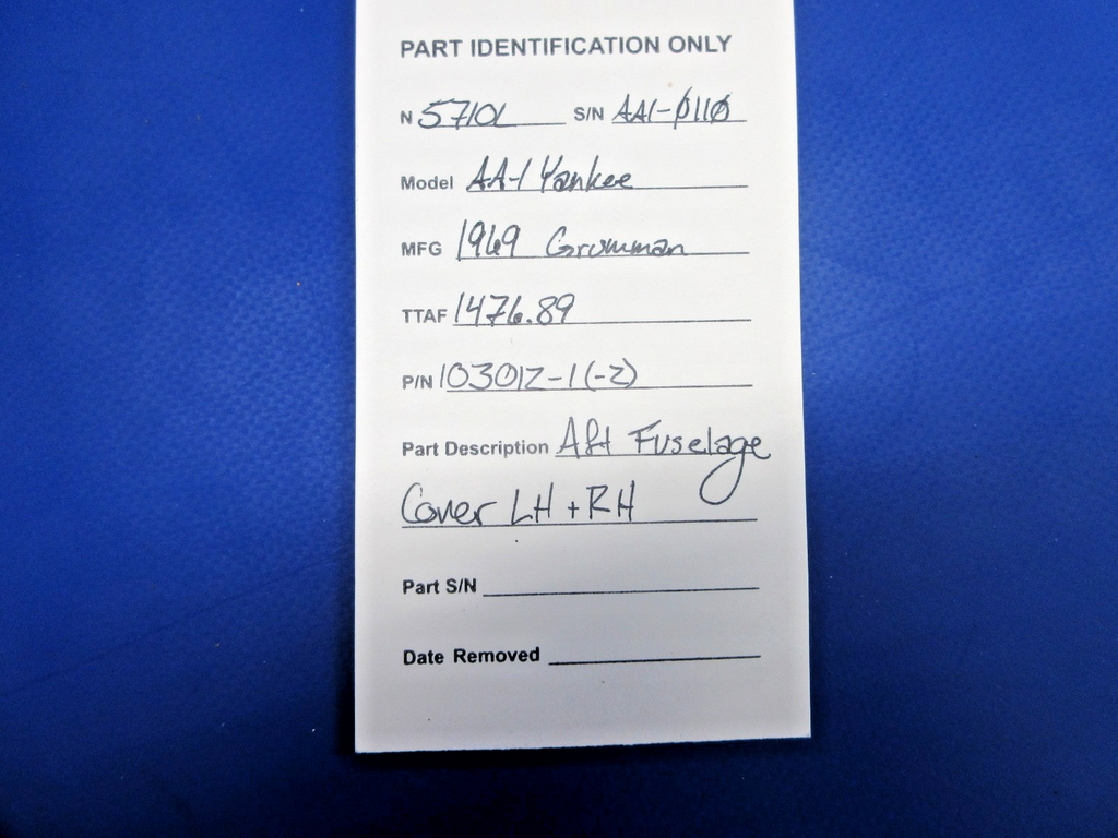 Grumman AA-1 AFT Fuselage Cover Left Hand + Right Hand. P/N 103012-1, 103012-2. Removed in good condition from a parted out 1969 Grumman AA-1 N5710L, S/N AA1-0110. TTAF 1,476.89. Guaranteed to pass inspection or your money back.