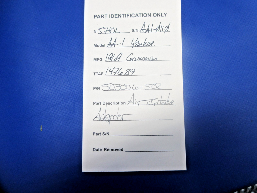 Grumman AA-1 Air Intake Adapter. P/N 503006-502. Removed in good condition from a parted out 1969 Grumman AA-1 N5710L, S/N AA1-0110. TTAF 1,476.89. Guaranteed to pass inspection or your money back.