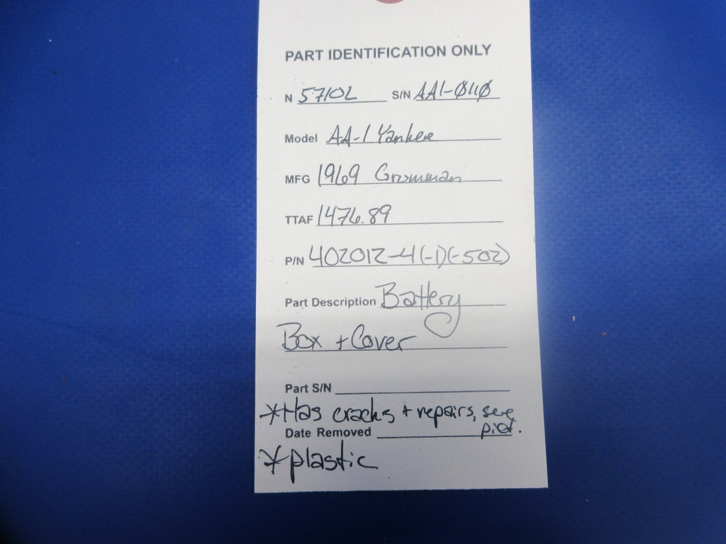 Grumman AA-1 Battery Box Cover. P/N 402012-4, 402012-1, 402012-502. Has cracks and repairs see picture. Plastic. Removed in good condition from a parted out 1969 Grumman AA-1 N5710L, S/N AA1-0110. TTAF 1,476.89. Guaranteed to pass inspection or your money back.
