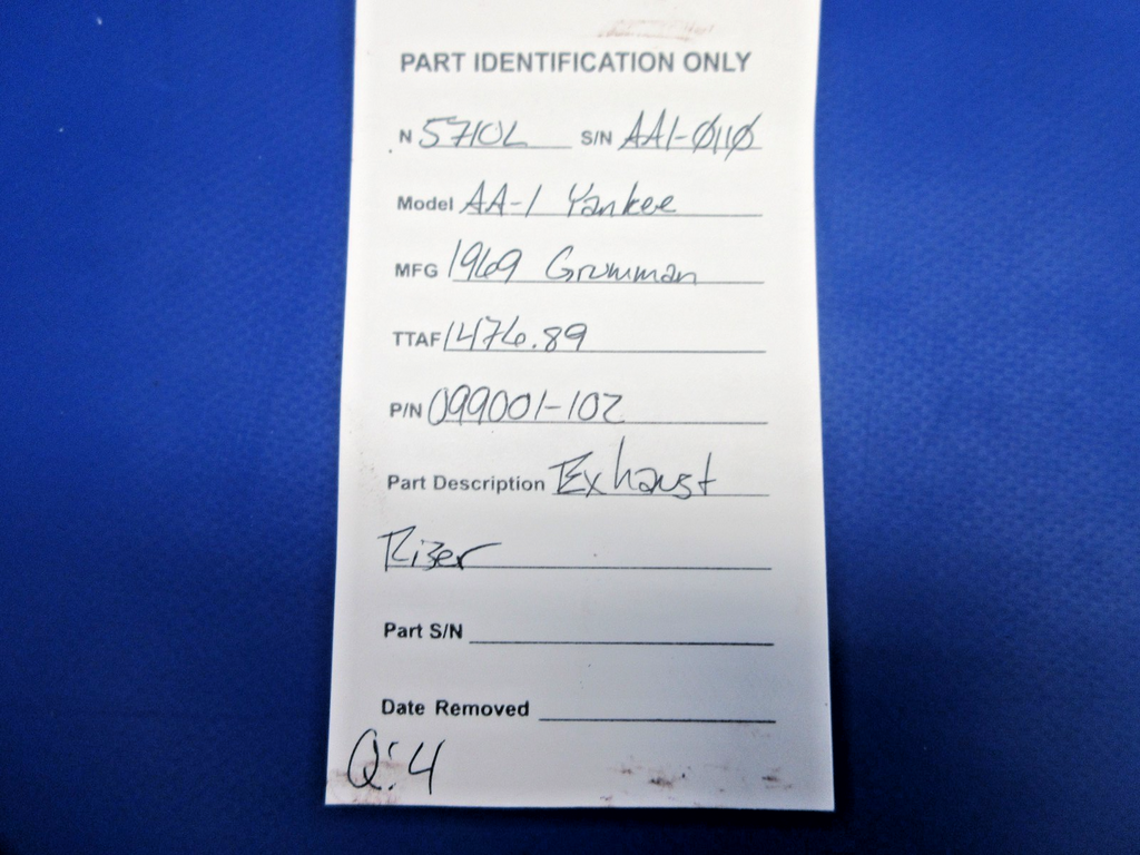 Grumman AA-1 Exhaust Riser. P/N 099001-102. Due to multiple quantities buyer may not receive exact item pictured. Removed in good condition from a parted out 1969 Grumman AA-1 N5710L, S/N AA1-0110. TTAF 1,476.89. Guaranteed to pass inspection or your money back.