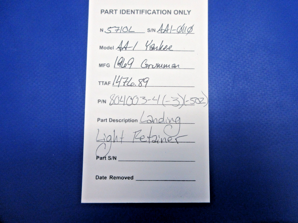 Grumman AA-1 Landing Light Retainer. P/N 804003-4, 804003-3, 804003-502. Removed in good condition from a parted out 1969 Grumman AA-1 N5710L, S/N AA1-0110. TTAF 1,476.89. Guaranteed to pass inspection or your money back.