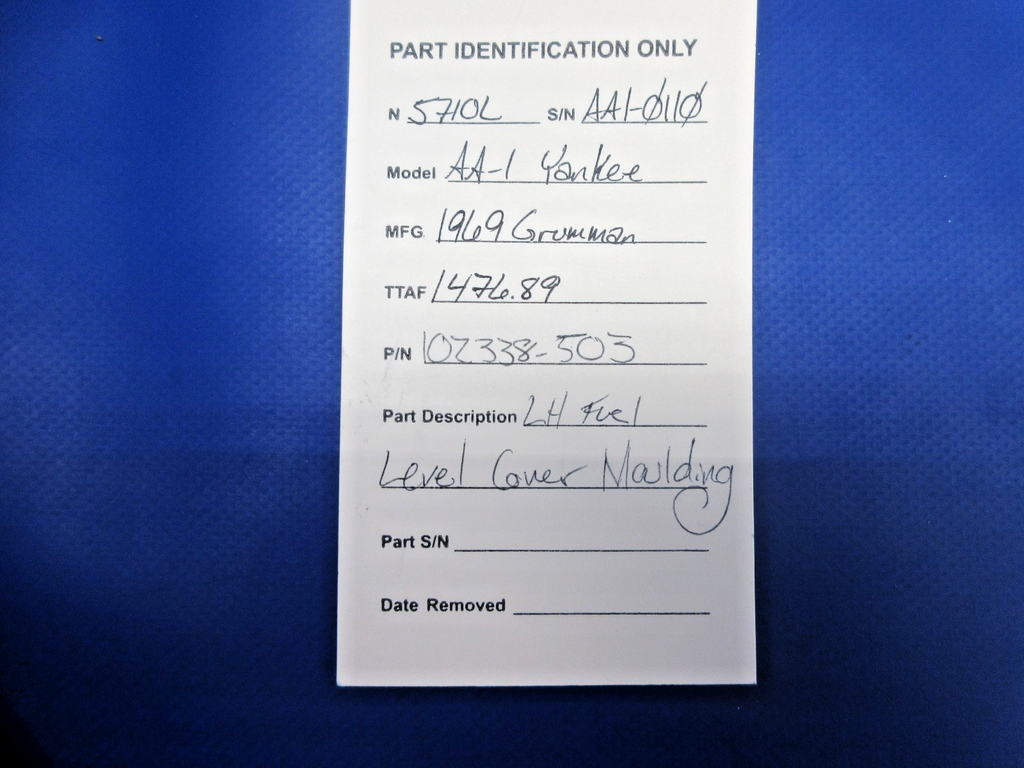 Grumman AA-1 Left Hand Fuel Level Cover Mounding. P/N 102338-503. Removed in good condition from a parted out 1969 Grumman AA-1 N5710L, S/N AA1-0110. TTAF 1,476.89. Guaranteed to pass inspection or your money back.