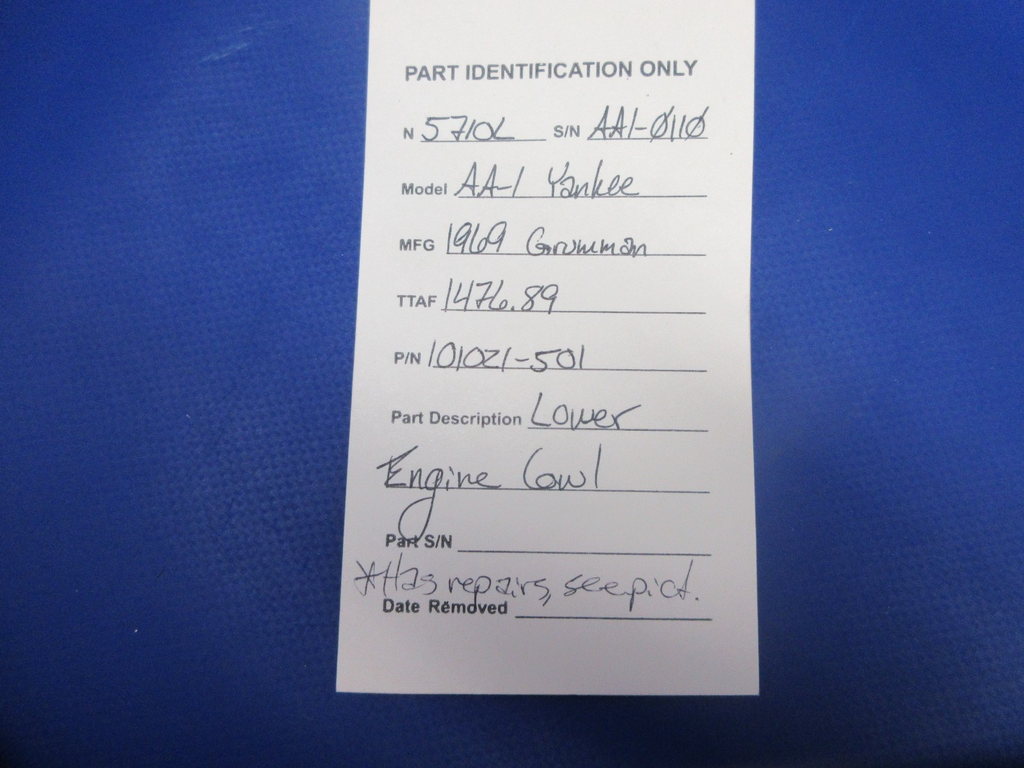 Grumman AA-1 Lower Engine Cowl. P/N 101021-501. Has repairs see picture. Removed in good condition from a parted out 1969 Grumman AA-1 N5710L, S/N AA1-0110. TTAF 1,476.89. Guaranteed to pass inspection or your money back.