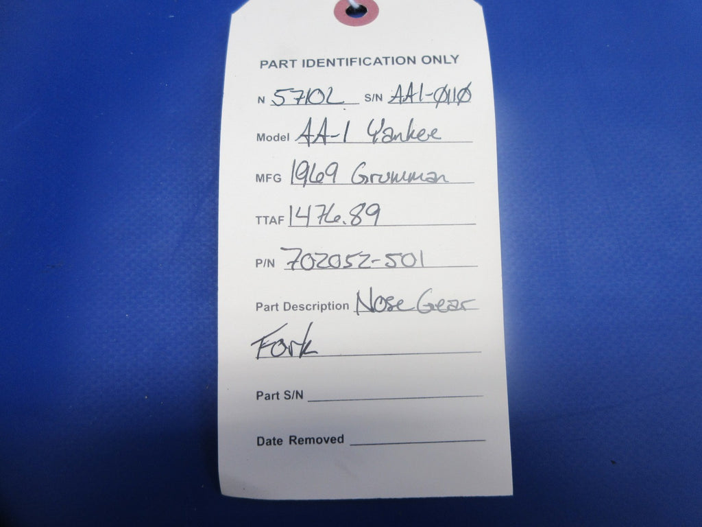 Grumman AA-1 Nose Gear Fork. P/N 702052-501. Removed in good condition from a parted out 1969 Grumman AA-1 N5710L, S/N AA1-0110. TTAF 1,476.89. Guaranteed to pass inspection or your money back.