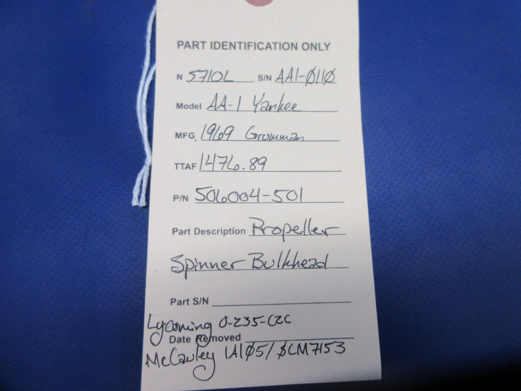 Grumman AA-1 Propeller Spinner Bulkhead. P/N 506004-501. Lycoming O-235-C2C. McCauley 1A105/SCM7153. Removed in good condition from a parted out 1969 Grumman AA-1 N5710L, S/N AA1-0110. TTAF 1,476.89. Guaranteed to pass inspection or your money back.