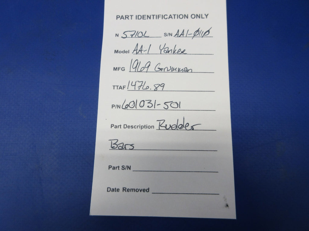 Grumman AA-1 Rudder Bars. P/N 601031-501. Removed in good condition from a parted out 1969 Grumman AA-1 N5710L, S/N AA1-0110. TTAF 1,476.89. Guaranteed to pass inspection or your money back.