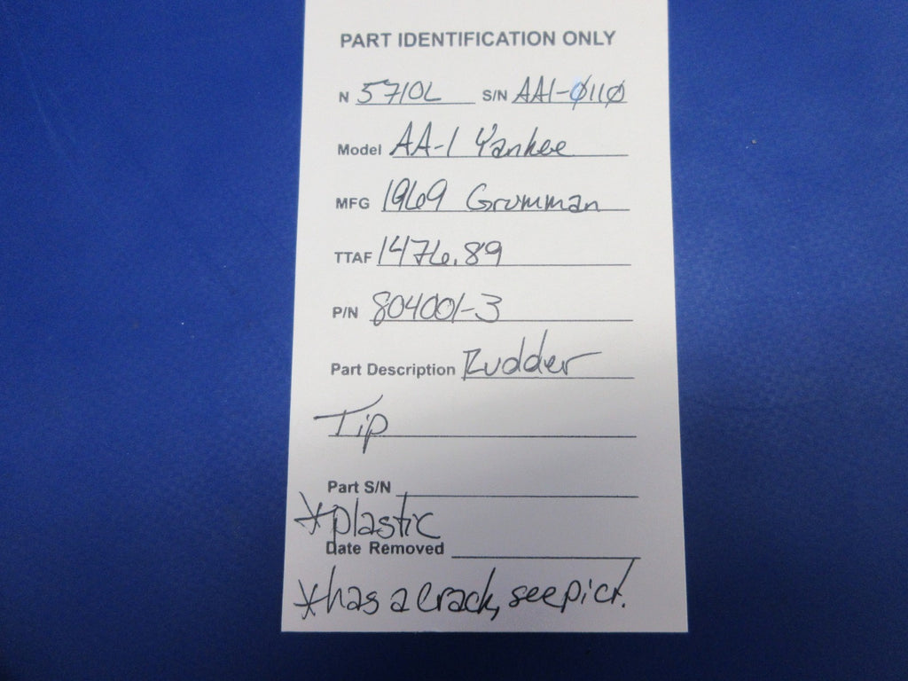 Grumman AA-1 Rudder Tip. P/N 804001-3. Plastic. Has a crack at screw hole see picture. Removed in good condition from a parted out 1969 Grumman AA-1 N5710L, S/N AA1-0110. TTAF 1,476.89. Guaranteed to pass inspection or your money back.