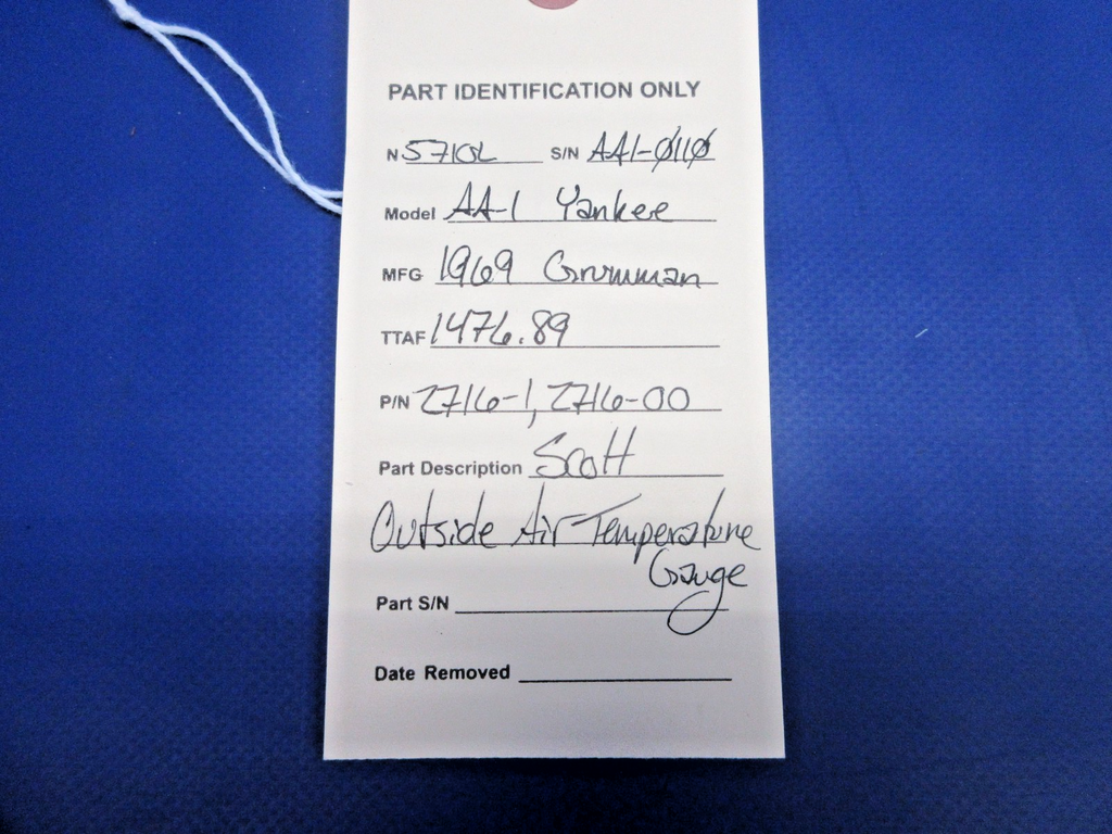 Grumman AA-1 Scott Outside Air Temperature Gauge P/N 2716-1, 2716-00. Removed in good condition from a parted out 1969 Grumman AA-1 N5710L, S/N AA1-0110. TTAF 1,476.89. Guaranteed to pass inspection or your money back.