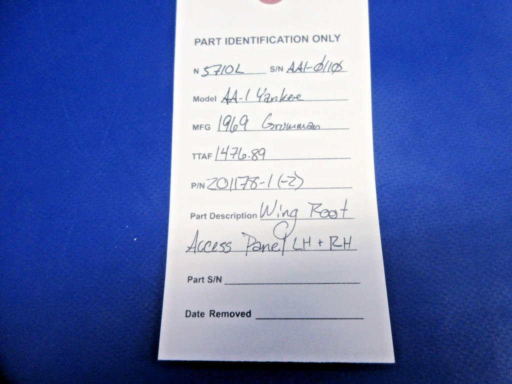 Grumman AA-1 Wing Root Access Panel Left Hand & Right Hand. P/N 201178-1, 201178-2. Removed in good condition from a parted out 1969 Grumman AA-1 N5710L, S/N AA1-0110. TTAF 1,476.89. Guaranteed to pass inspection or your money back.