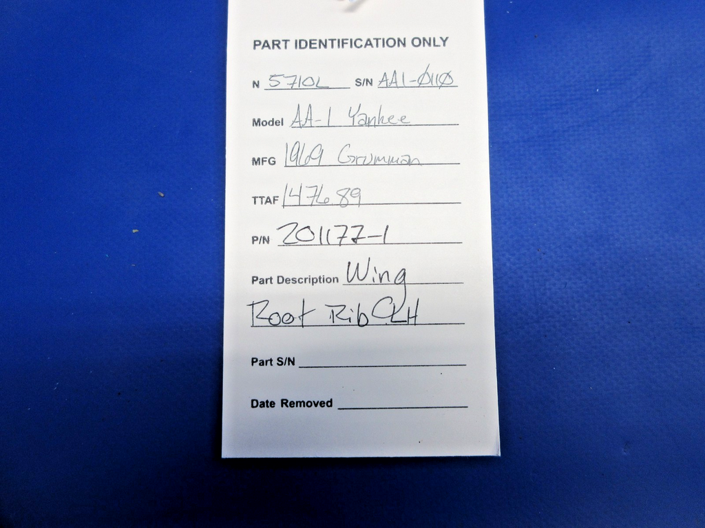 Grumman AA-1 Wing Root Rib Left Hand. P/N 201177-1. Removed in good condition from a parted out 1969 Grumman AA-1 N5710L, S/N AA1-0110. TTAF 1,476.89. Guaranteed to pass inspection or your money back.