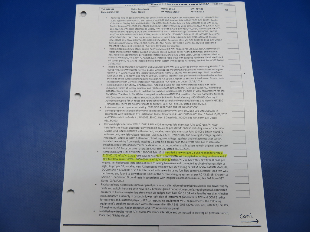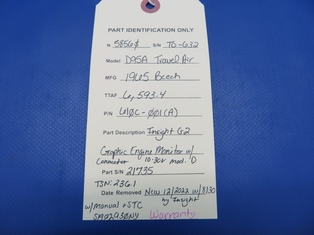 TSN: 236.1 hrs. We are unable to test this unit, however, we are selling this unit with a 30 day warranty. Removed in good condition from a parted out 1965 Beech D95A Travel Air N5856S, S/N TD-632 TTAF 6,593.4. Guaranteed to pass inspection or your money back.