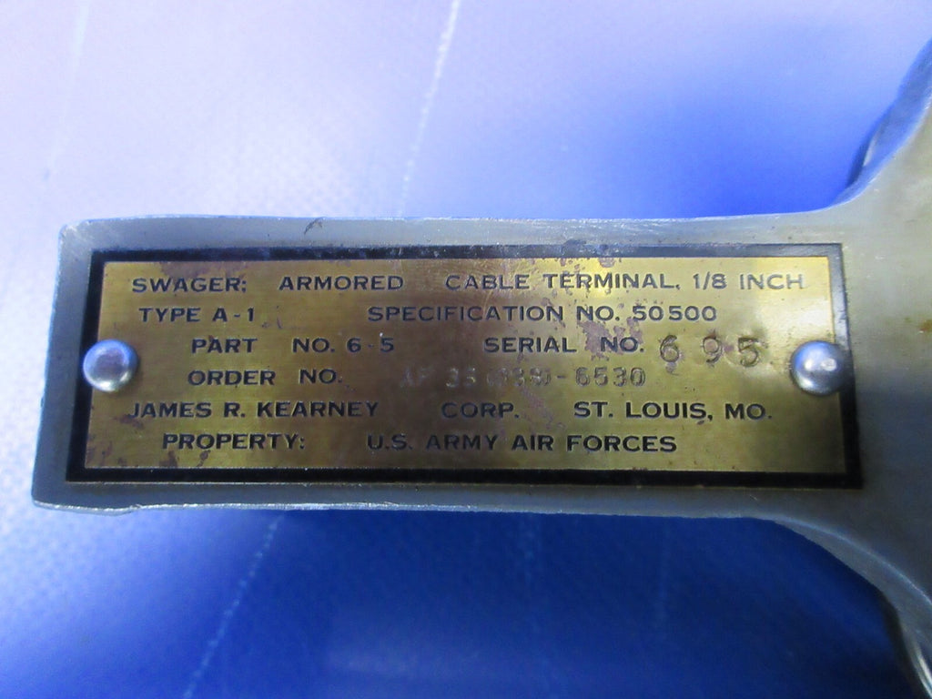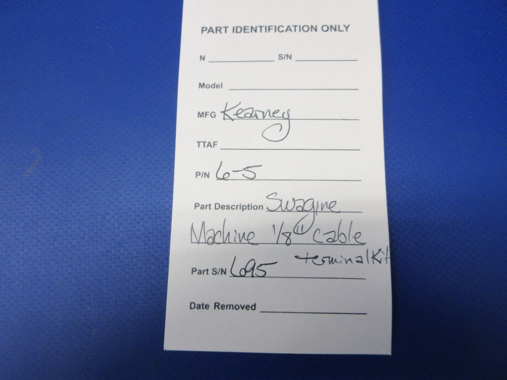 Kearney Aviation Swaging Machine 1/16", 3/32", & 1/8" Cable - Straight Terminal Die Kit. P/N 6-5. S/N 695. Guaranteed to pass inspection or your money back.