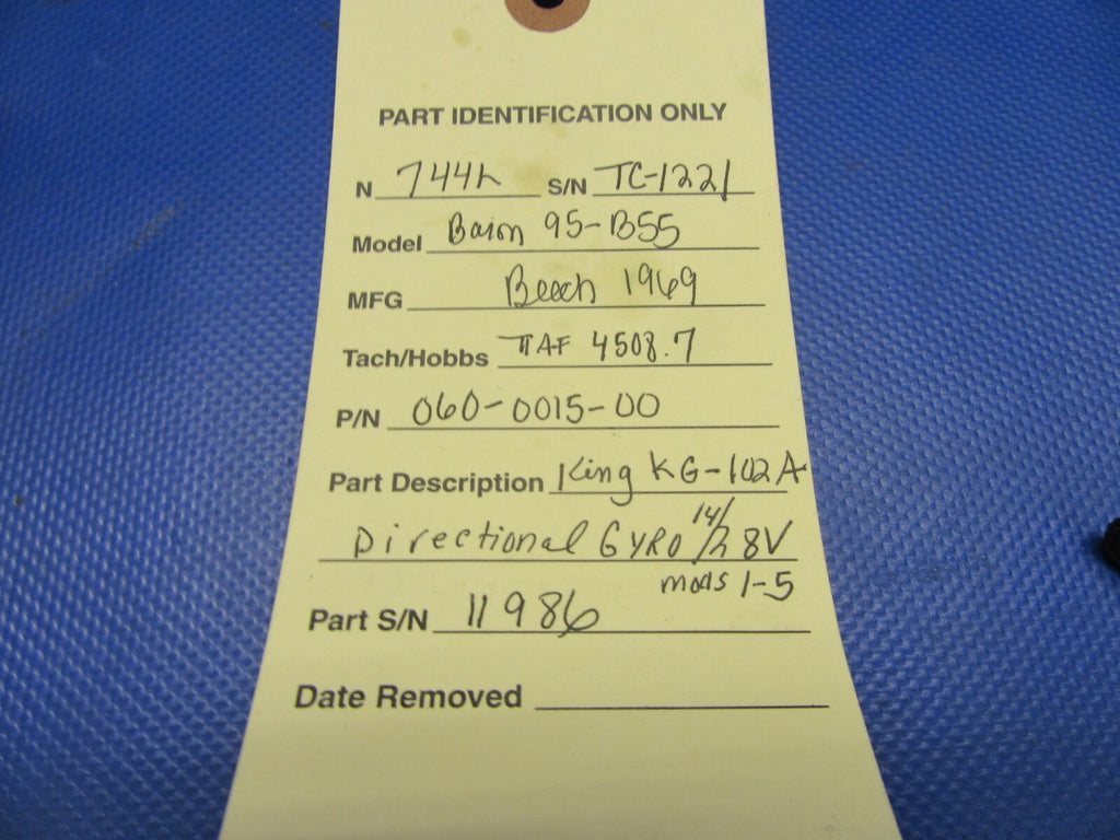 King KG-102A Directional Gyro 14 Volts / 24 Volts. Mods 1-5. P/N 060-0015-00. S/N 11986. CORE. Removed from a parted out 1969 Beech Baron 95-B55 N744L, S/N TC-1221. Aircraft TT: 4508.7.