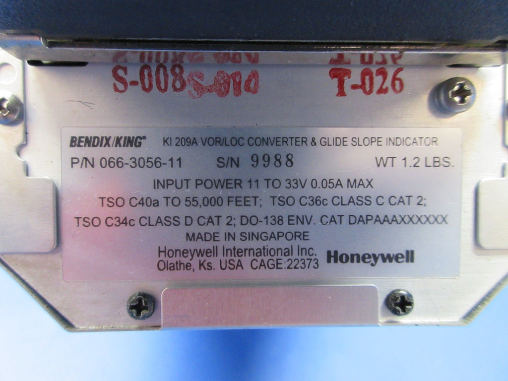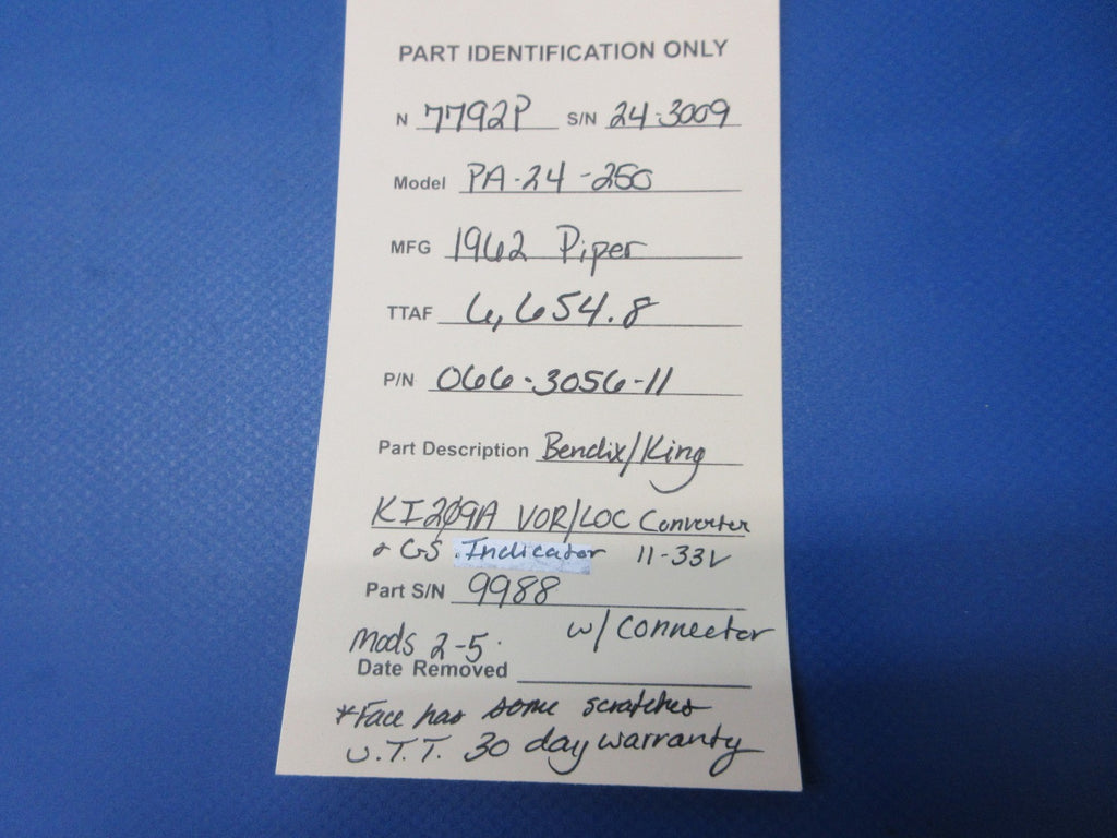 Piper PA-24-250 Bendix/King KI209A VOR/LOC Converter and GS Indicator with Connector 11-33 volts. P/N 066-3056-11. S/N 9988. Mods 2-5. Face has some scratches, see pictures. We are unable to test this unit, however, we are selling this unit with a 30 day warranty. Removed in good condition from a parted out 1962 Piper PA-24-250 N7792P, S/N 24-3009. TTAF 6,654.8. Guaranteed to pass inspection or your money back.