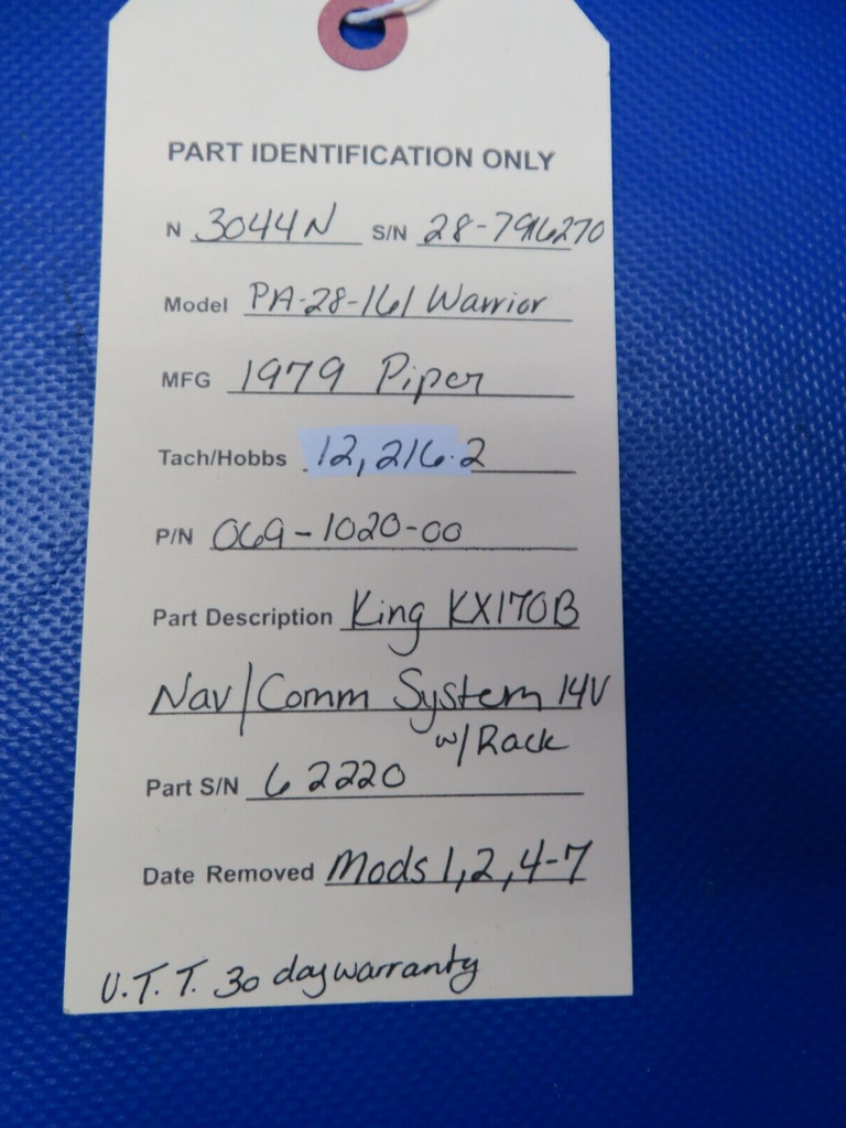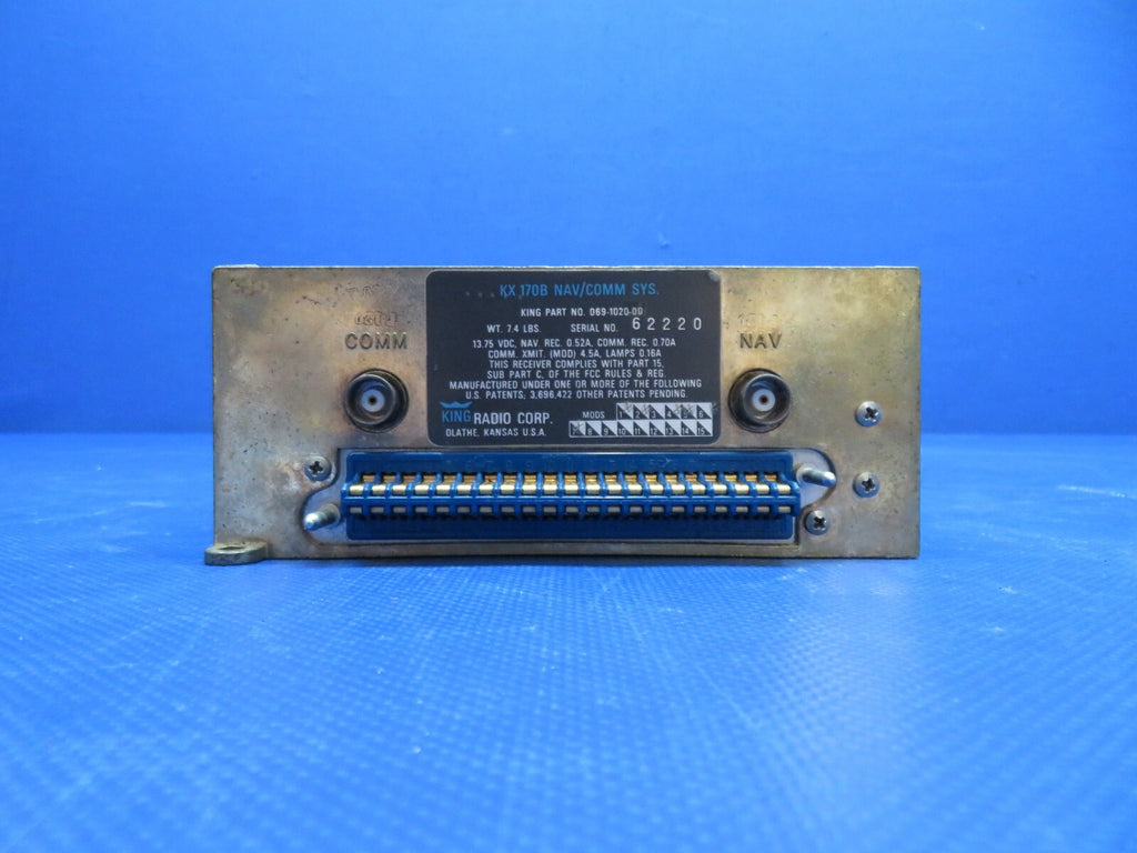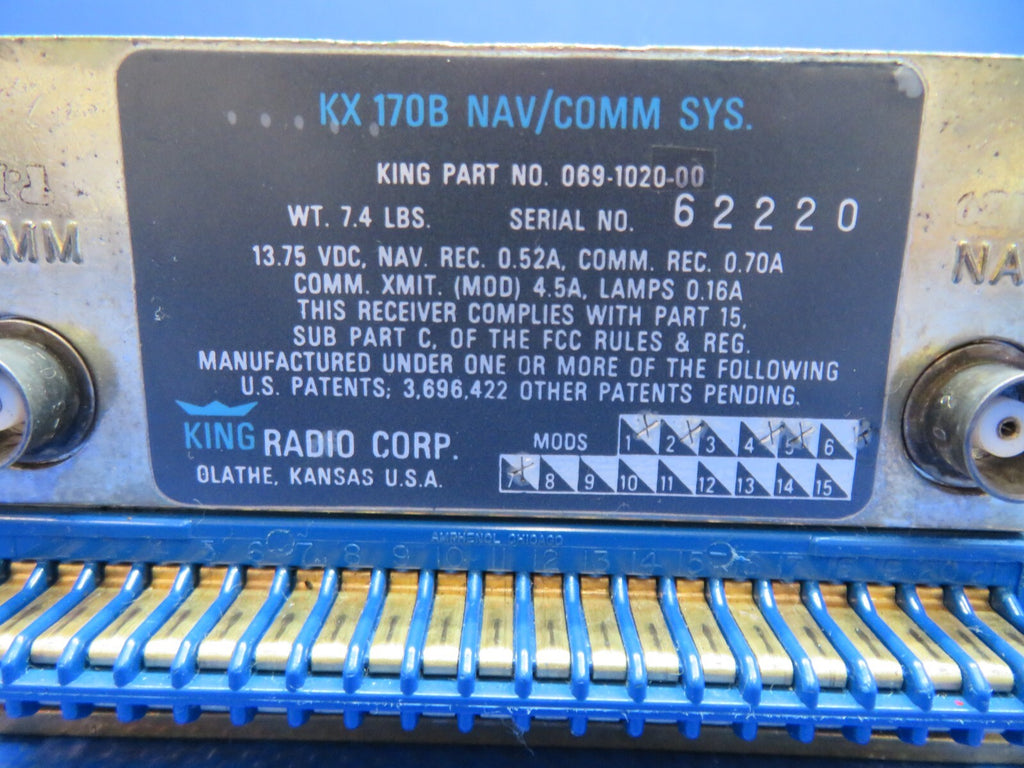 King KX170B Nav/Com System 14v w/ Rack. P/N 069-1020-00. S/N 62220. Mods 1,2, 4-7. Com is barely audible. Removed from a parted out 1979 Piper PA-28-161 Warrior N3044N, S/N 28-7916270. TTAF 12,216.2.