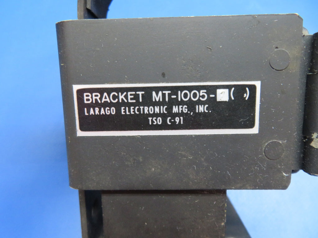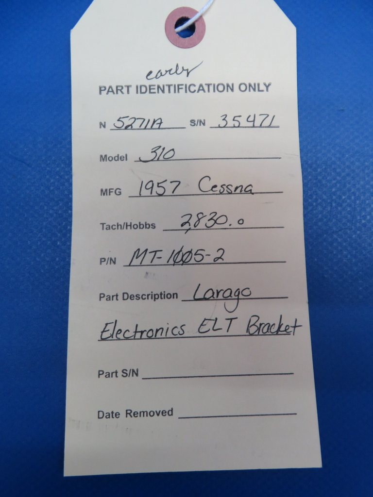 Larago Electronics ELT Bracket. P/N MT-1005-2. Removed in good condition from a parted out 1957 Cessna 310 N5271A, S/N 35471. TTAF 2,830.00. Guaranteed to pass inspection or your money back.