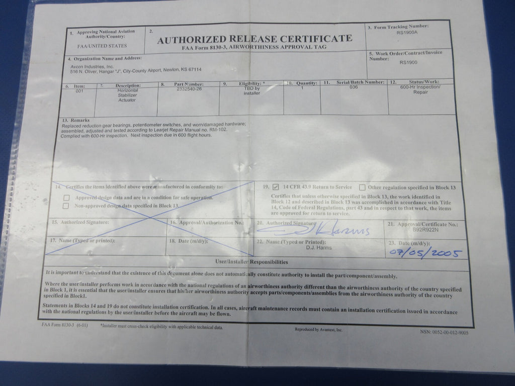 Learjet Horizontal Stabilizer Actuator. P/N 2332540-26. S/N 036. Has 8130 for 600 hour inspection / repair on 07/05/2005 - Unit has been in storage since. Guaranteed to pass inspection or your money back.