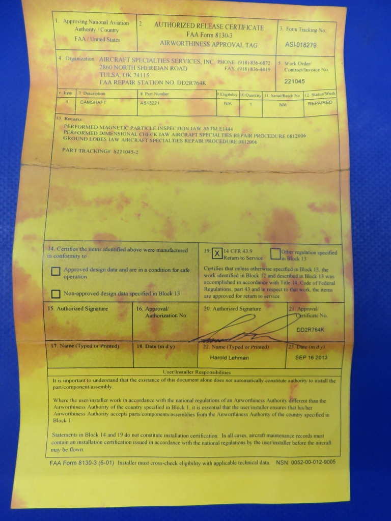 Lycoming Camshaft P/N 13221 REPAIRED (1125-182)