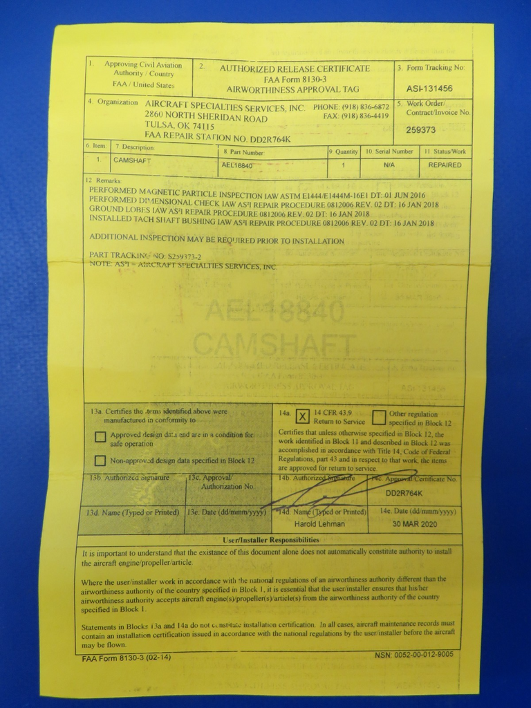 . REPAIRED with 8130 on 03/30/2020 By Aircraft Specialties. Guaranteed to pass inspection or your money back.