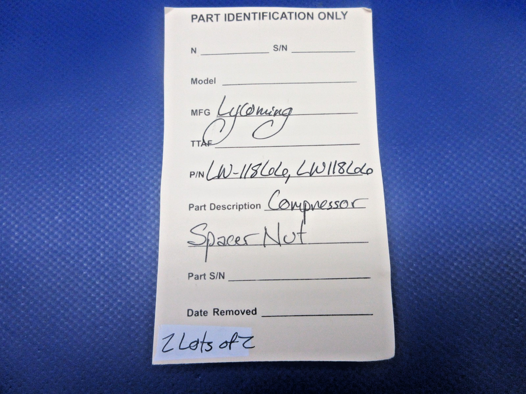 Lycoming Compressor Spacer Nut. P/N LW-11866, LW11866. LOT OF 2. Due to multiple quantities buyer may not receive exact item pictured. Guaranteed to pass inspection or your money back.