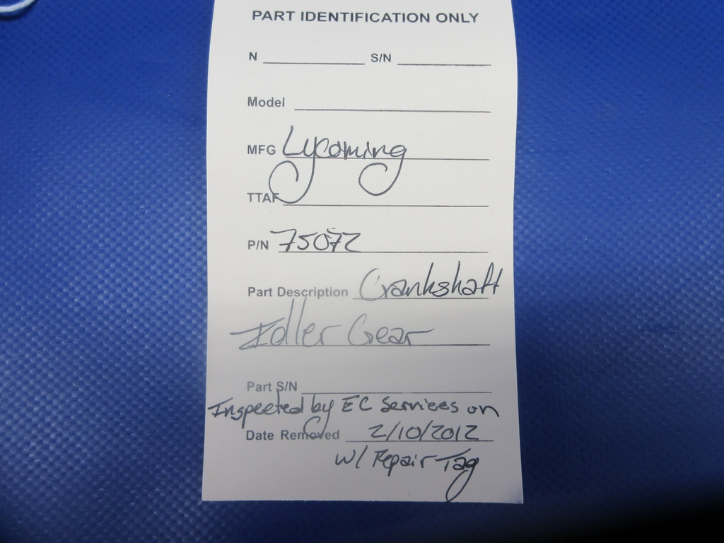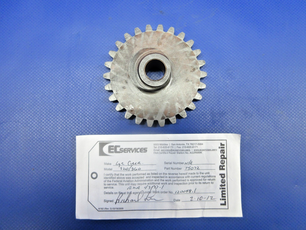 Lycoming Crankshaft Idler Gear. P/N 75072. Inspected by EC Services on 02/10/2012 with repair tag. Guaranteed to pass inspection or your money back.
