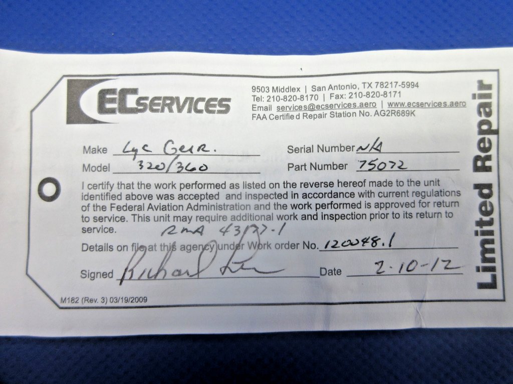 We are a full-service aircraft maintenance shop that sells new aircraft parts from surplus inventory auctions and parts from salvaged airplanes. We try to be as clear as possible in the descriptions of the items we have listed for sale. If you have any questions regarding the suitability or condition of a part, please let us know, and we will have one of our mechanics check it out and give an honest answer as to its condition. Unless otherwise noted, we will ship the majority of our items via UPS. Free shipping is usually USPS. Tracking information will be sent to the Email account on file with PayPal, so please make sure your information is up to date.