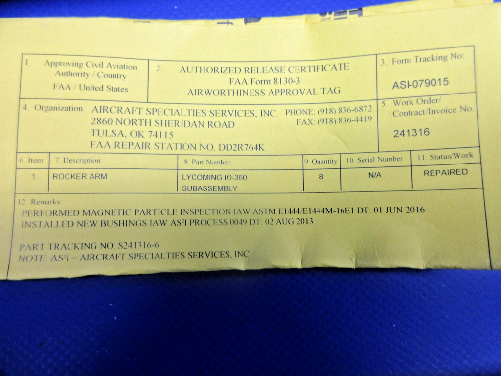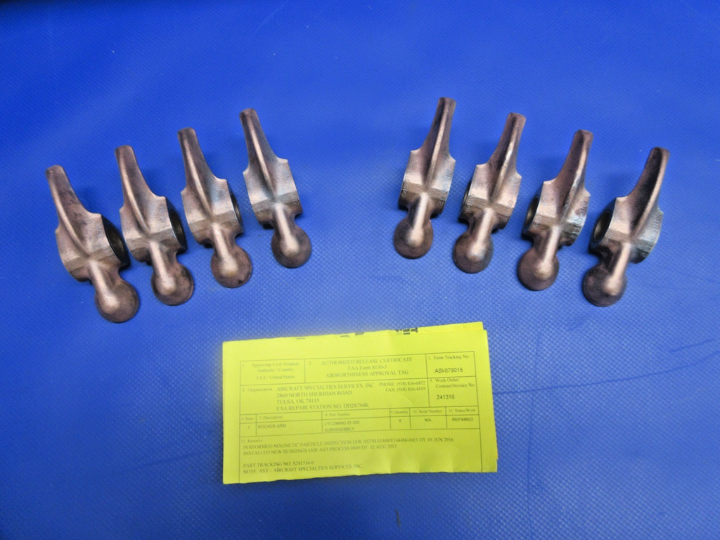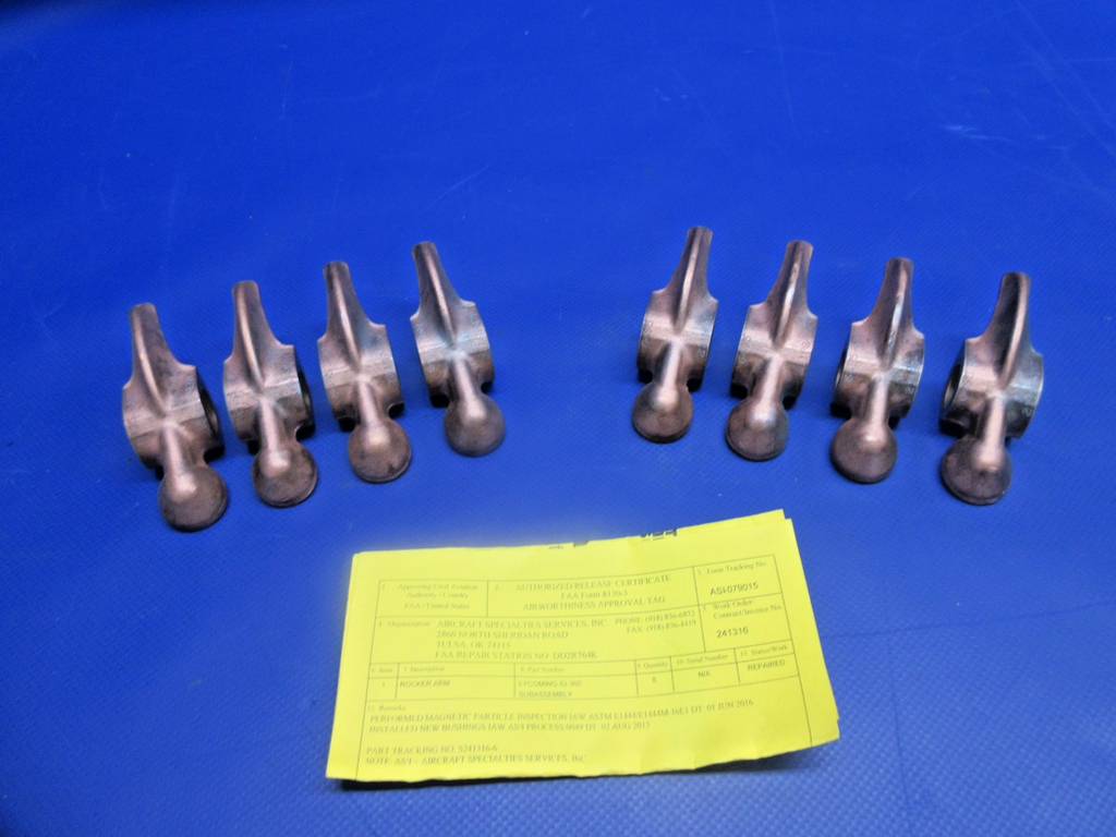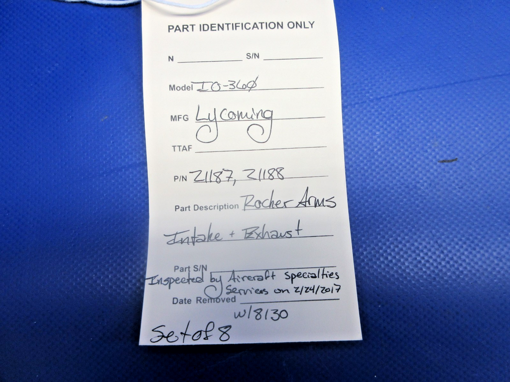 Lycoming IO-360 Rocker Arms Intake & Exhaust With 8130. P/N 21187, 21188. SET OF 8. Inspected by Aircraft Specialties Services on 02/24/2017. Guaranteed to pass inspection or your money back.
