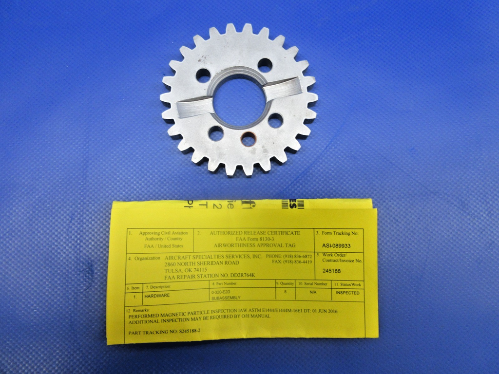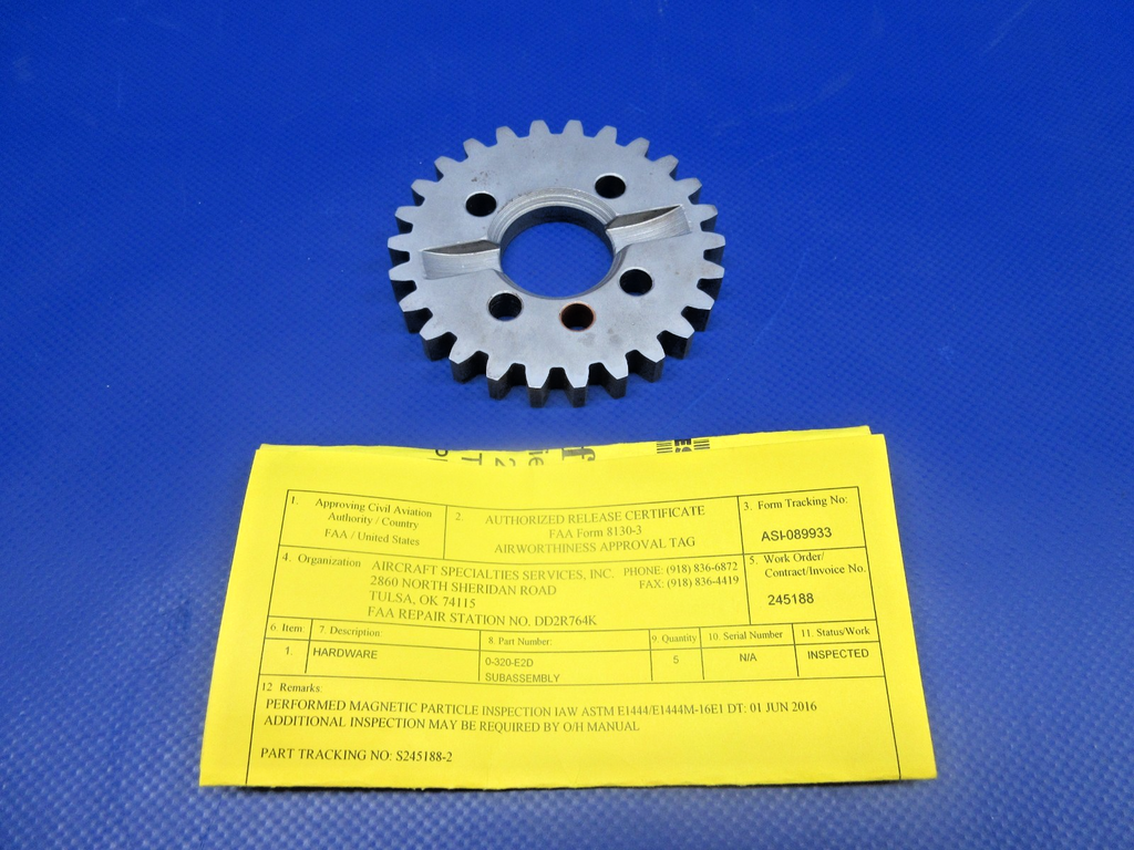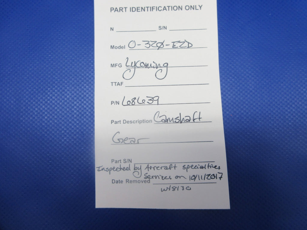 Lycoming O-320-E2D Camshaft Gear W / 8130. P/N 68639. Inspected by Aircraft Specialties Services on 10/11/2017. Guaranteed to pass inspection or your money back.