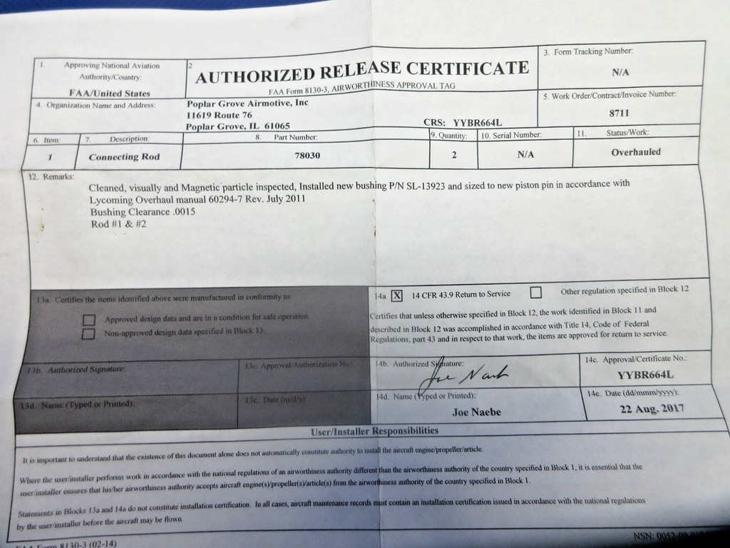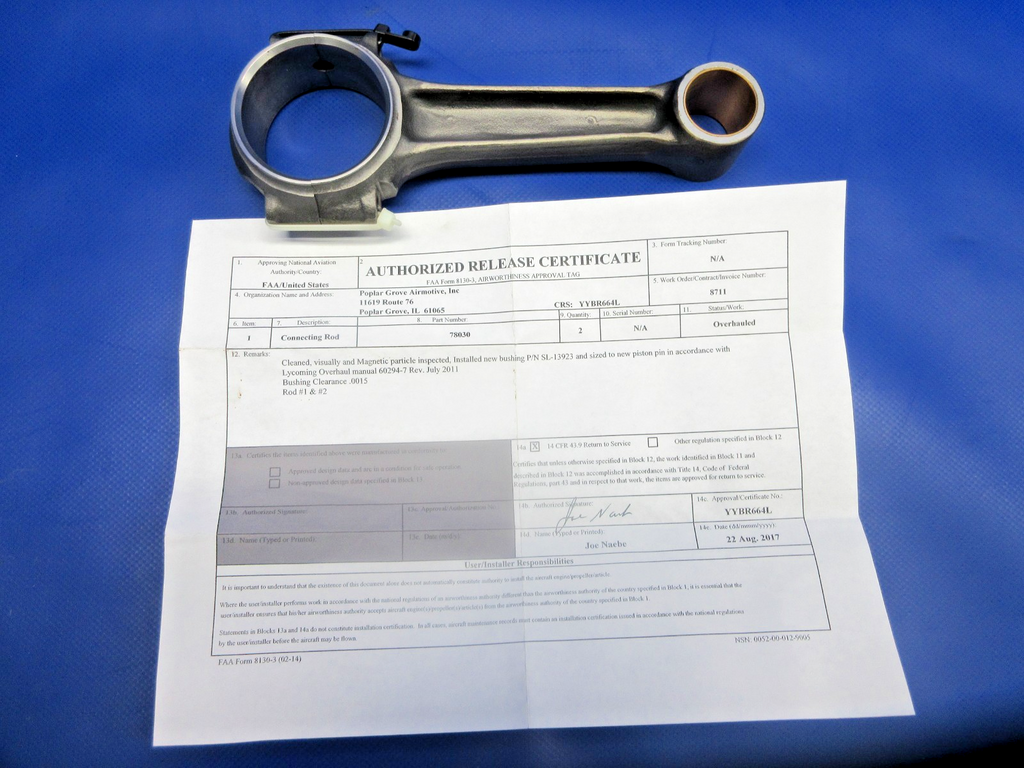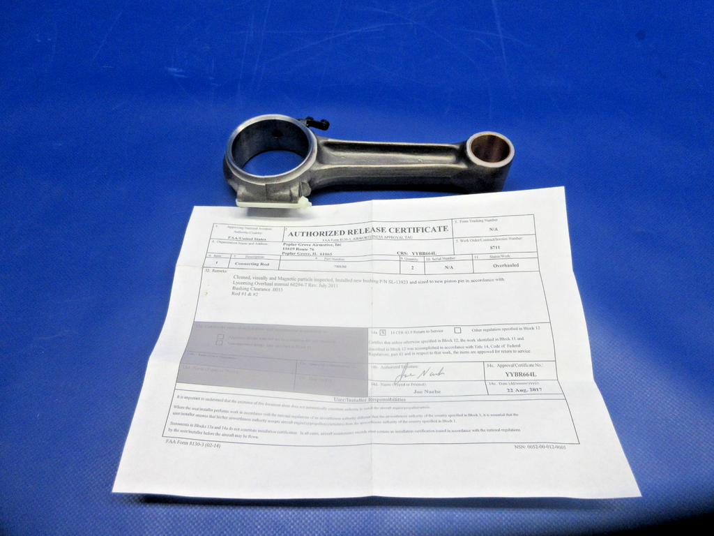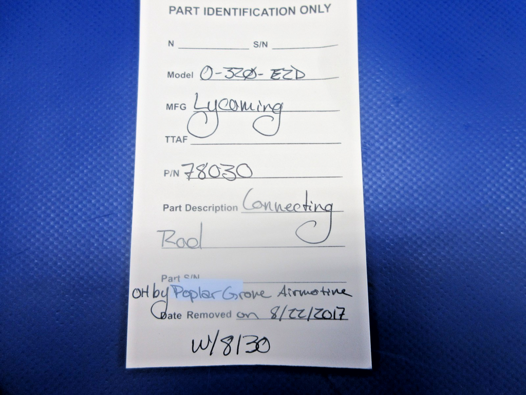 Lycoming O-320-E2D Connecting Rod W/8130. P/N 78030. OVERHAULED by Poplar Grove Airmotive on 08/22/2017. Guaranteed to pass inspection or your money back.