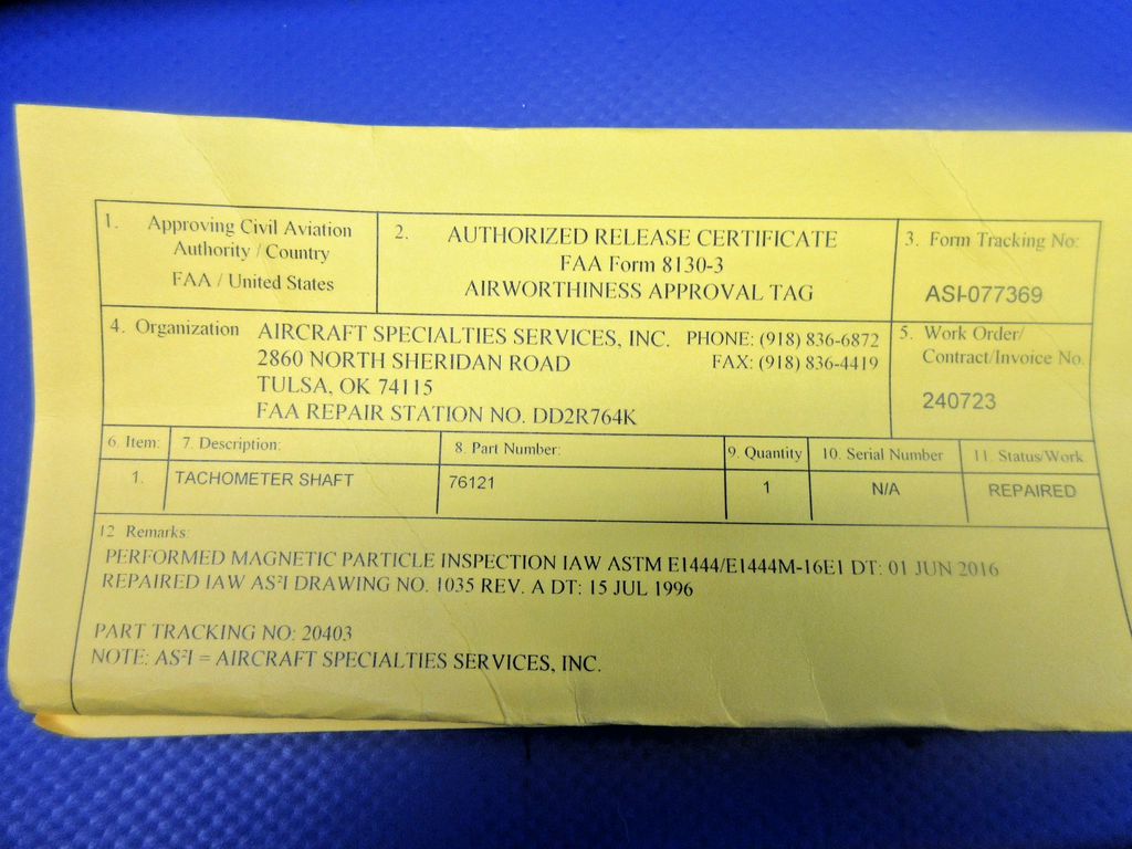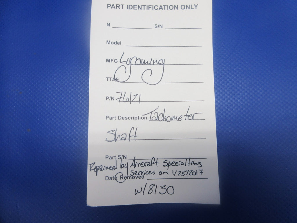 Lycoming Tachometer Shaft With 8130. P/N 76121. Repaired by Aircraft Specialties Service on 01/25/2017. Guaranteed to pass inspection or your money back.