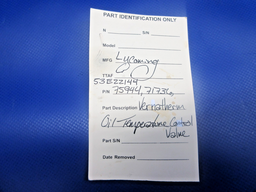 Lycoming Vernatherm Oil Temperature Control Valve. P/N 75944, 71736, 53E22144. Guaranteed to pass inspection or your money back.