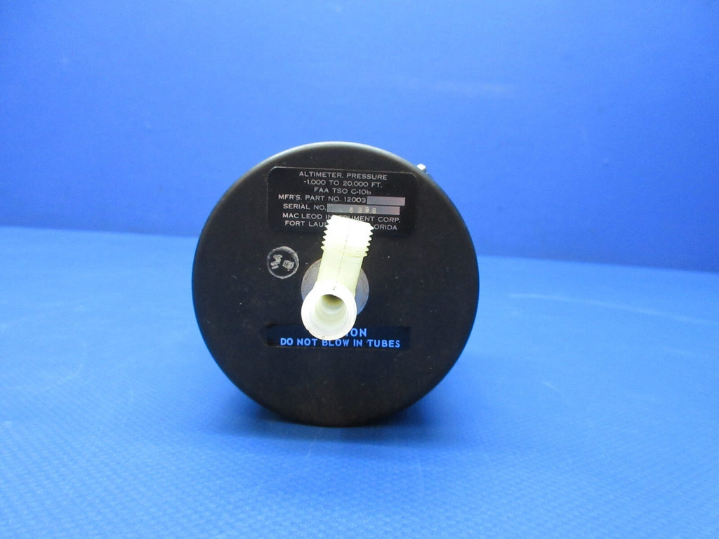 MacLeod Altimeter Pressure Indicator. P/N 12003. S/N 6998. CORE. Calibration off ~750 ft. Removed from a parted out 1969 Grumman AA-1 N5710L, S/N AA1-0110. TTAF 1,476.89.