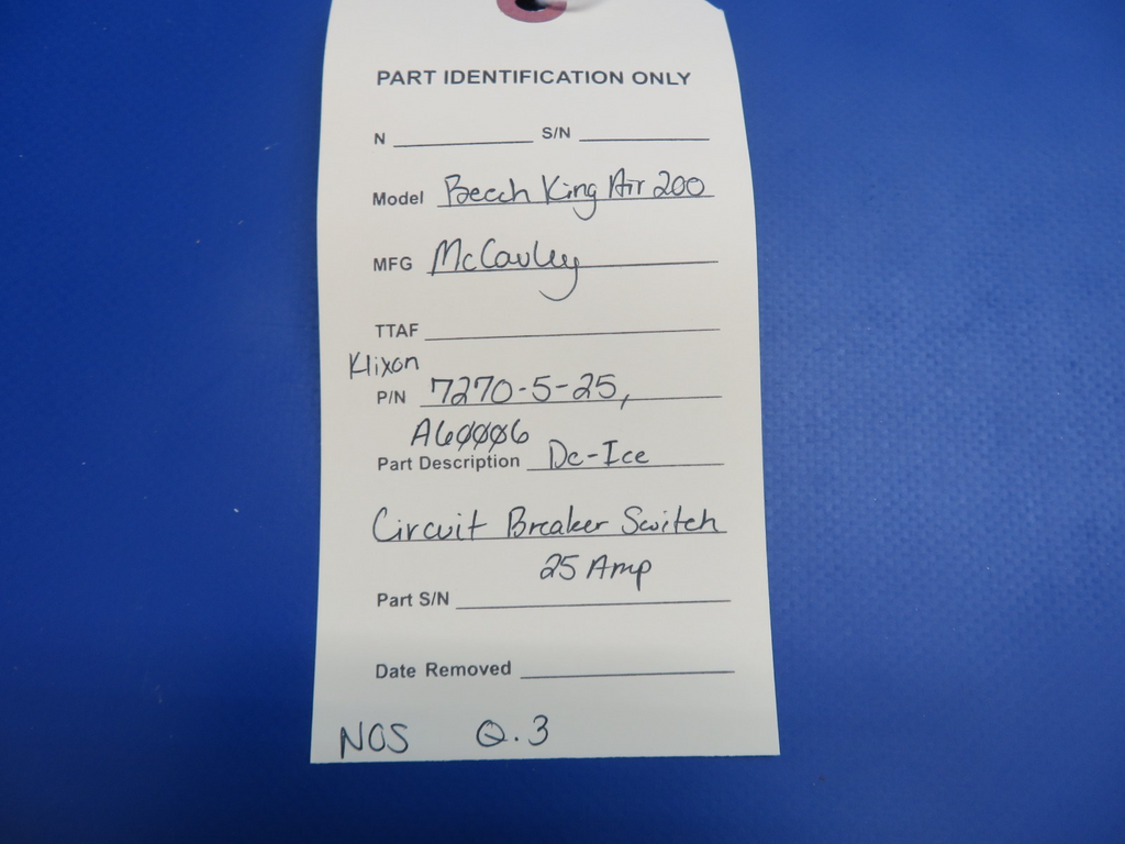 McCauley De-Ice Circuit Breaker Switch 25 Amps. Klixon P/N 7270-5-25. McCauley P/N A60006. NEW OLD STOCK. Due to multiple quantities, buyer may not receive exact item pictured. Guaranteed to pass inspection or your money back.