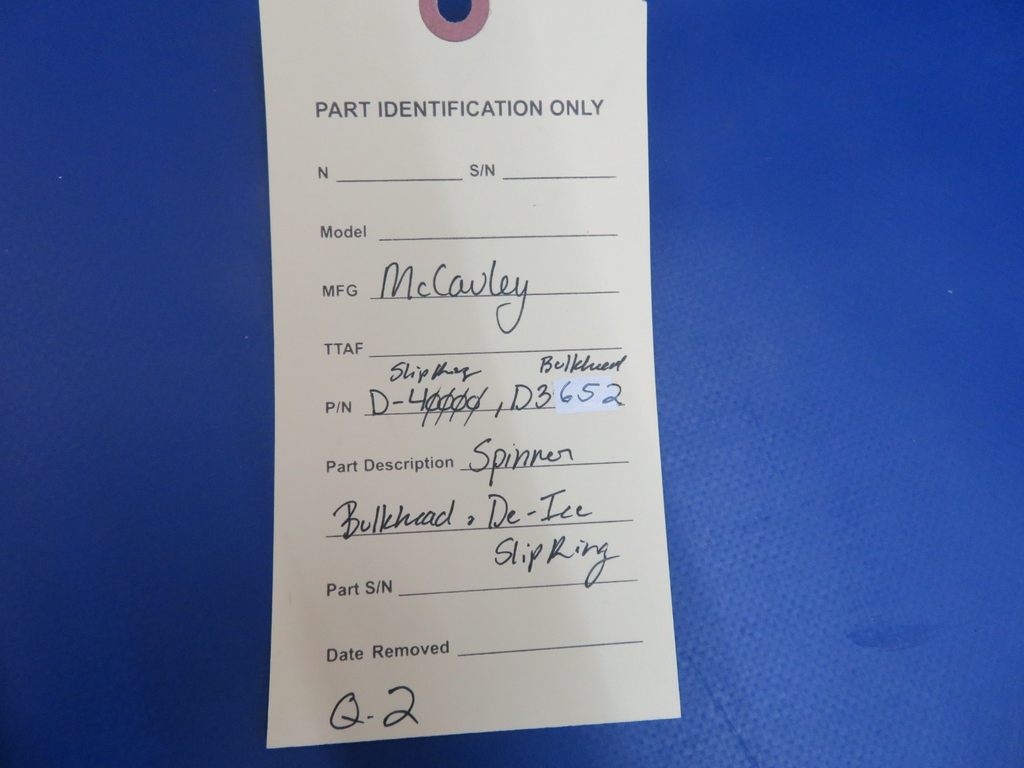 McCauley 3-Blade Propeller Spinner Bulkhead with Fillets and De-Ice Slip Ring. Bulkhead P/N D3652. Slip Ring P/N D40000. Due to multiple quantities, buyer may not receive exact item pictured. Guaranteed to pass inspection or your money back.
