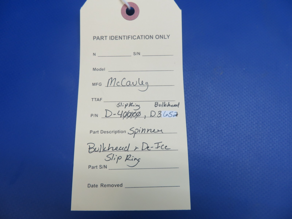 McCauley 3-Blade Propeller Spinner Bulkhead with Fillets and De-Ice Slip Ring. Bulkhead P/N D3652. Slip Ring P/N D40000. Guaranteed to pass inspection or your money back.