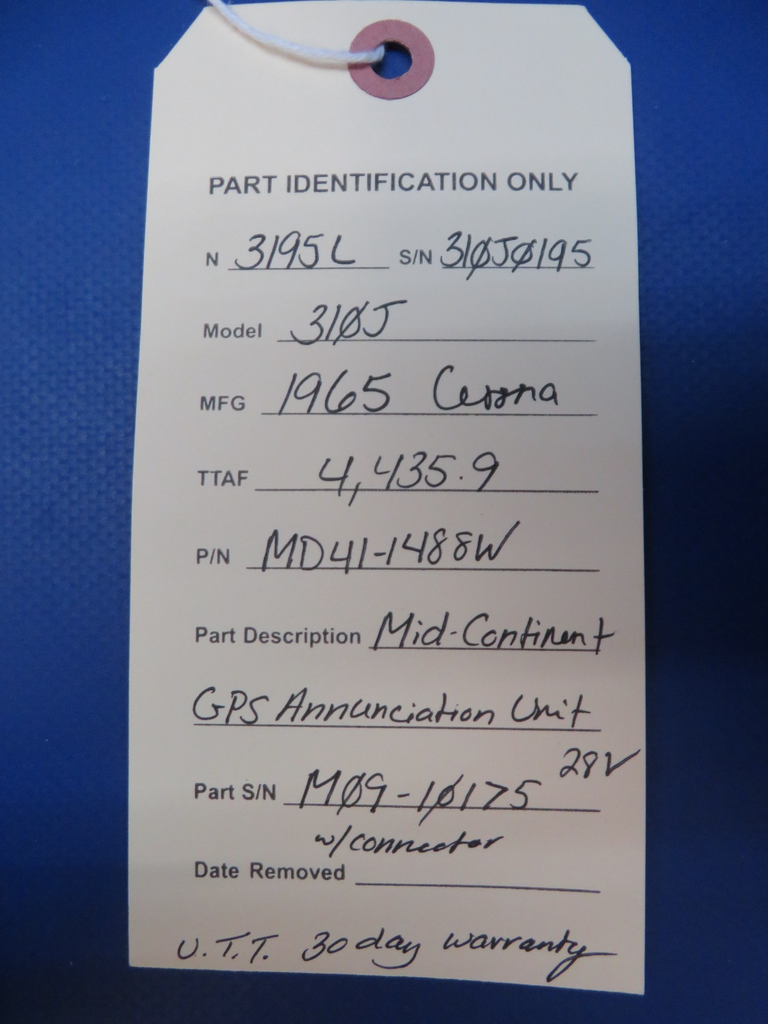 Cessna 310 / 310J Mid-Continent GPS Annunciation Unit with Connector 28v. P/N MD41-1488W. S/N M09-10175. We are unable to test this unit, however, we are selling this unit with a 30 day warranty. Removed in good condition from a parted out 1965 Cessna 310J N3195L, S/N 310J0195. TTAF 4,435.9. Guaranteed to pass inspection or your money back.