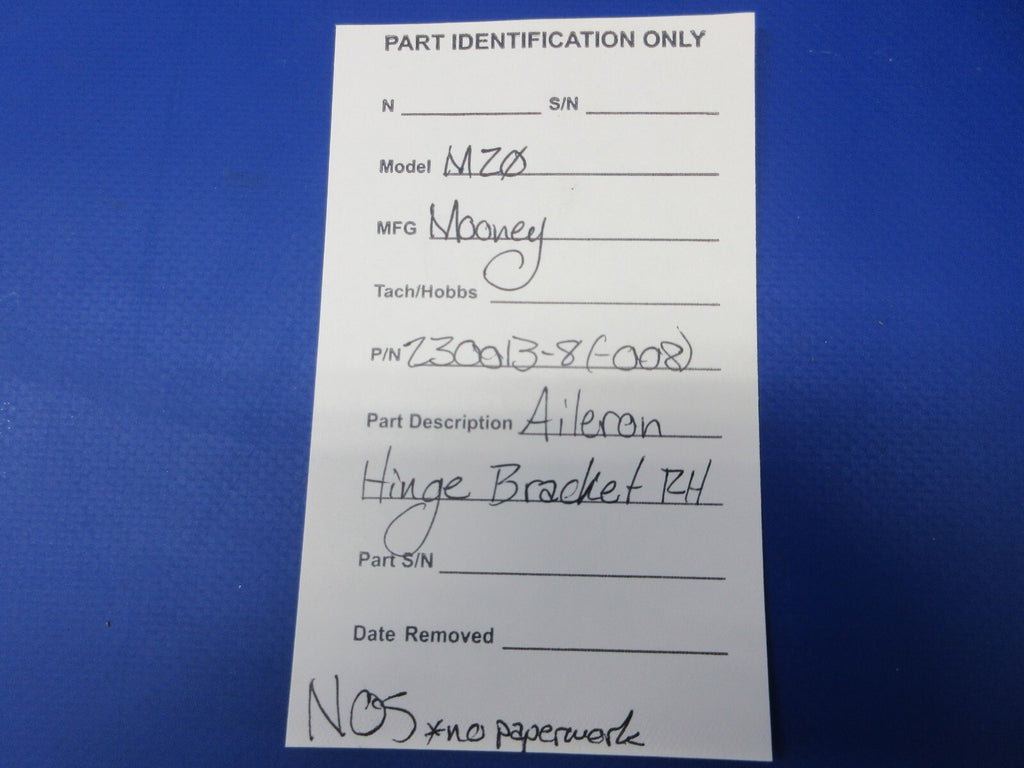 Mooney M20 Aileron Hinge Bracket Right Hand. P/N 230013-8, 230013-008. NEW OLD STOCK. No paperwork. Guaranteed to pass inspection or your money back.